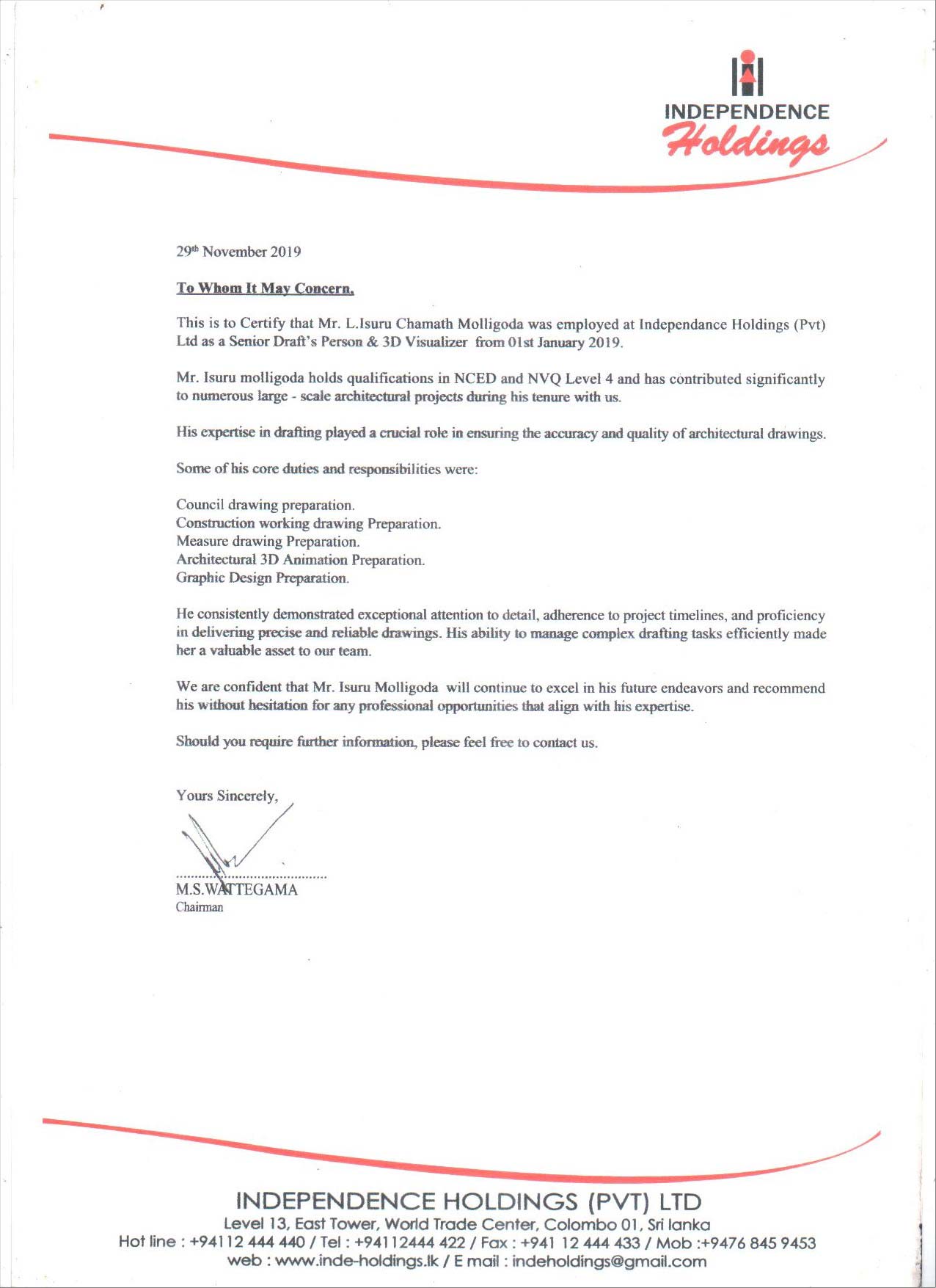 Independence Holdings (Pvt) Ltd (2019) - Worked as a Architectural Draught's Person & 3D Graphic Visualizer.