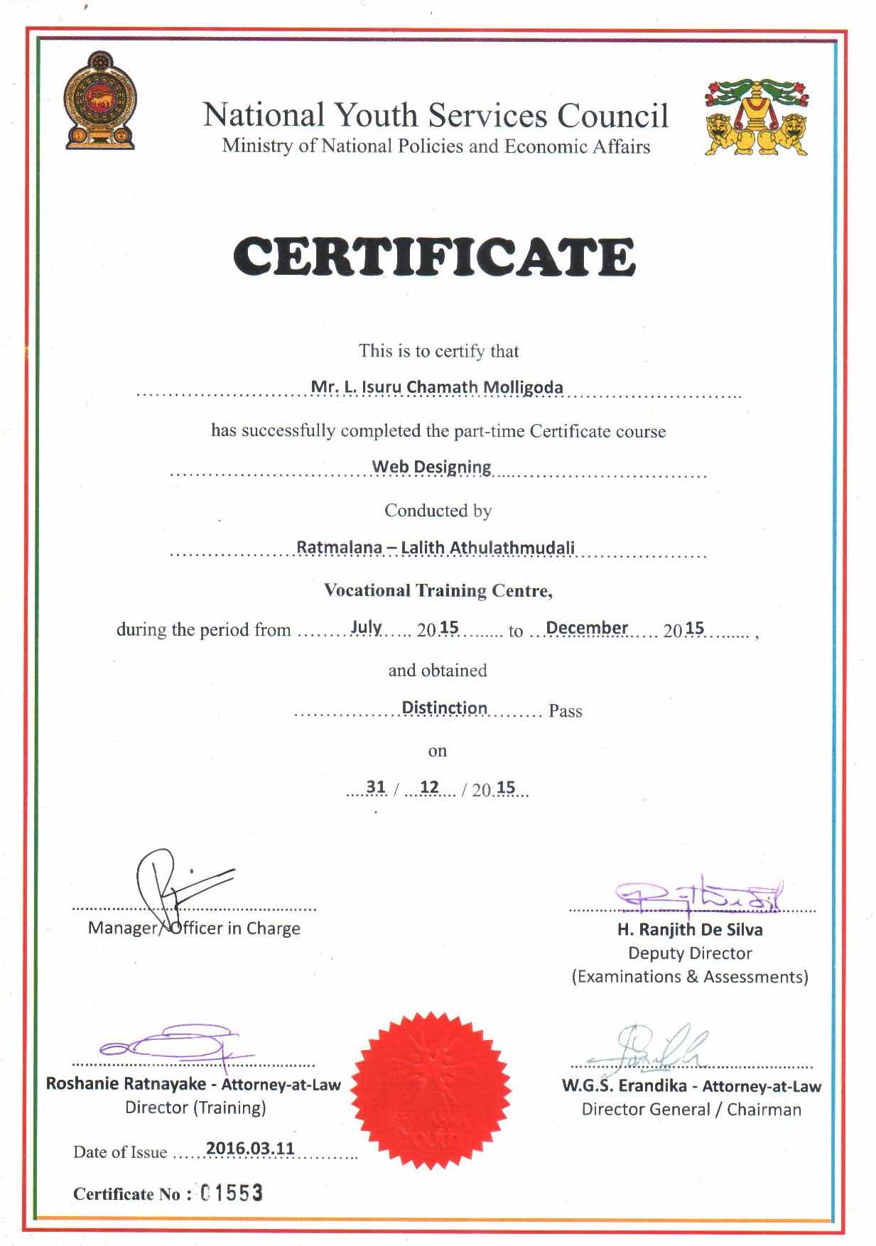 Completed the Certificate in Web Designing at Lalith Athulathmudali Vocational Training Center (LAVTC) in the 2015.